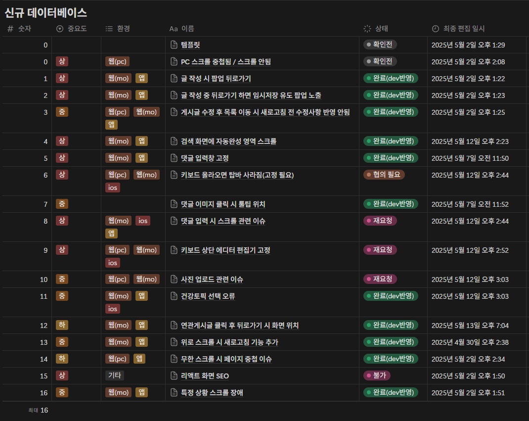 - 노션에 정리된 15개의 버그 항목에 대한 테스트 및 수정 작업 진행